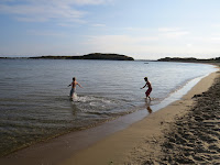 Et par medbrakte barnebarn koser seg på den flotte stranden.